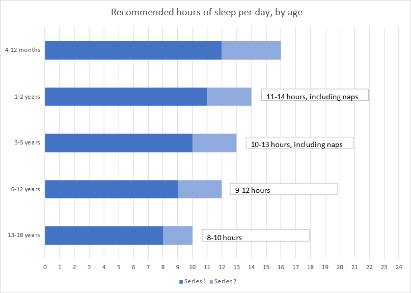 - 3 to 5 years: 10 to 13 hours per day (including naps)