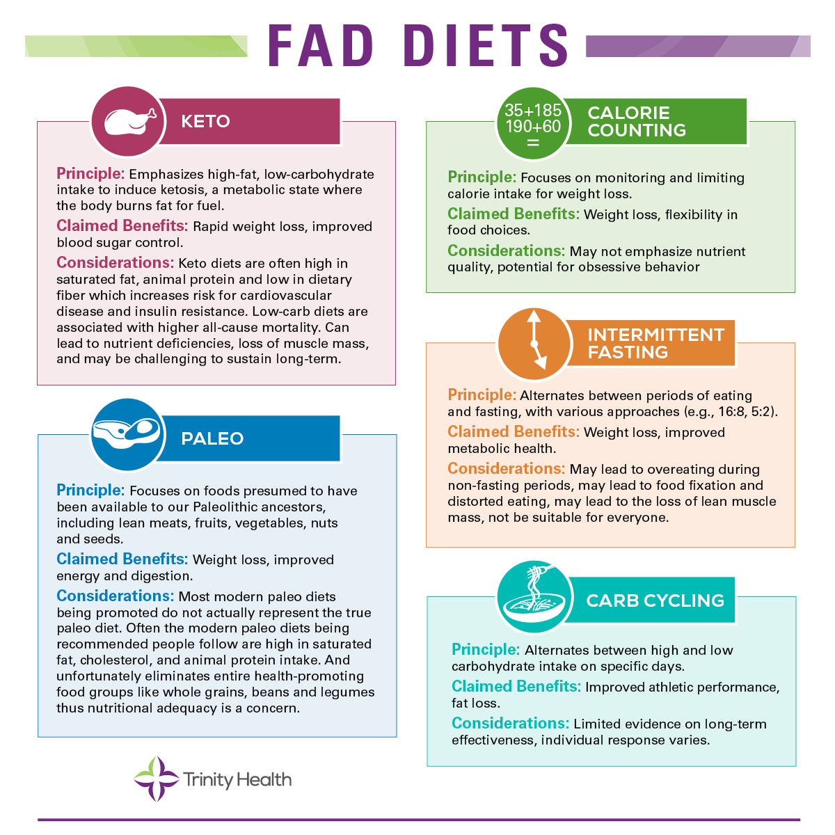 A new diet that gains popularity, promising a quick and easy way to lose weight is often called a “fad diet”. Some common fad diets or dietary restrictions are Keto, Paleo, calorie counting, intermittent fasting, and carb cycling - but not every diet trend is a good fit for your personal nutritional needs.
